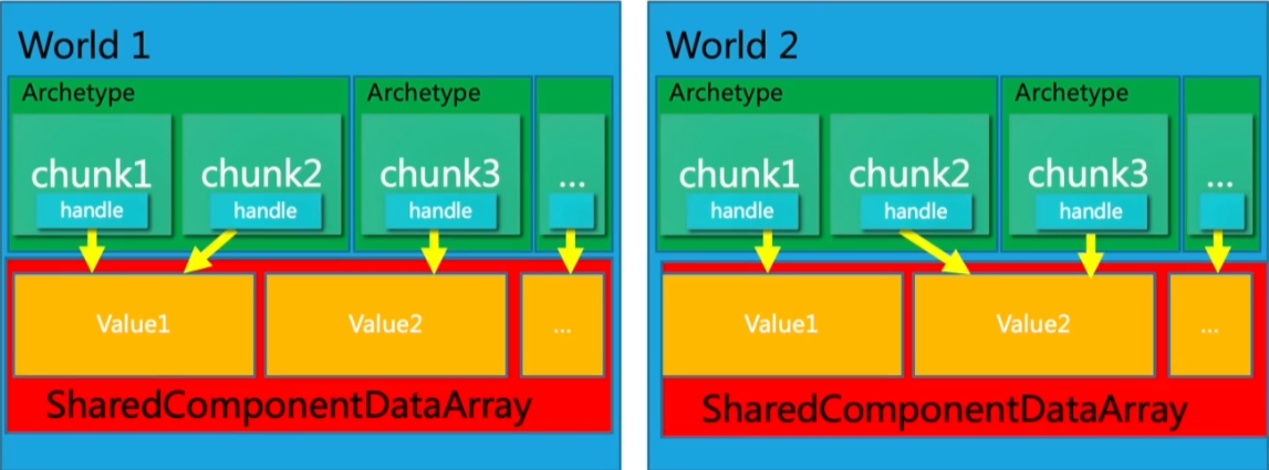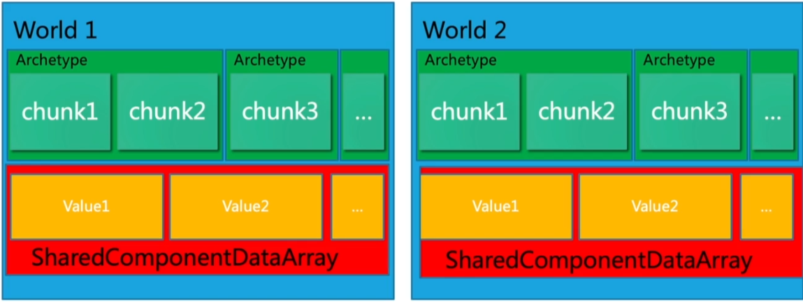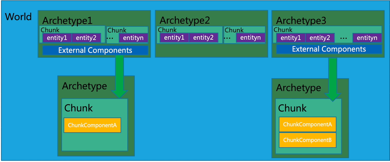 Archetype为一个相同组件的原型标识。假设EntityA与EntityB都是具有Postion和Rotation两个组件,那么他们就是同一种Archetype。而EntityC只有一个Position。他就属于另一种Archetype。而我们通过这种模式,在遍历的时候也可以更好的获得相应的原型