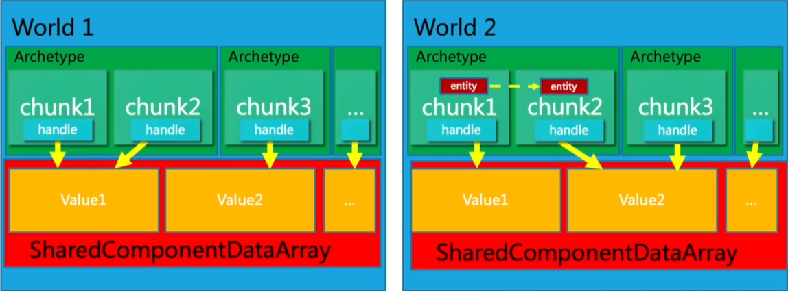 Structural Change:所有需要导致需要重新组织内存块或内存块内容的操作都被称之为structural Change,比如我们去给某个Entity删除或添加Component。又比如我们将某个Entity给移动到另一个Chunk块中等一系列操作内存的行为,添加或删除Entity也在其中